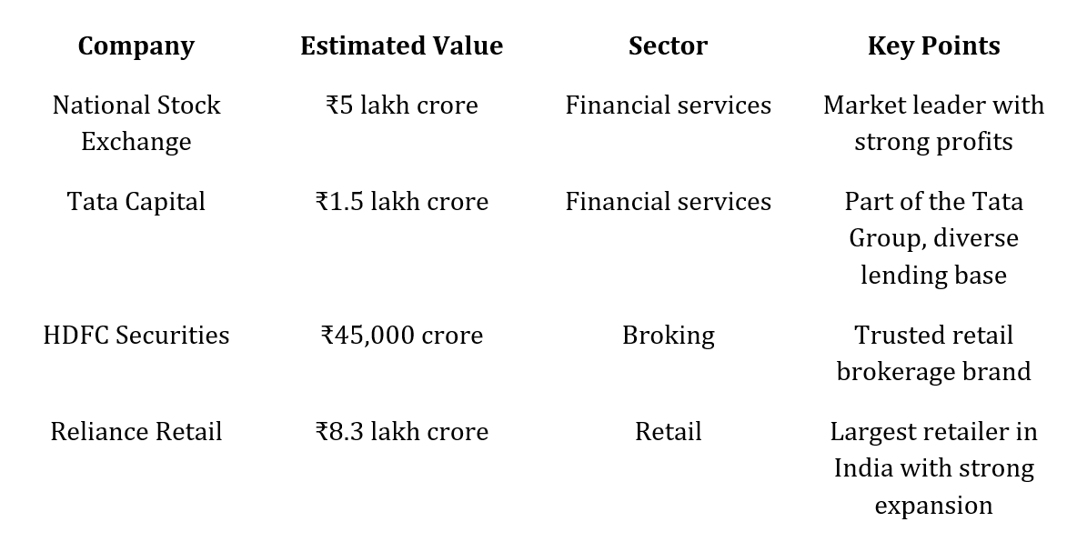 The Indian unlisted market covers many industries. You will find financial giants, consumer companies, technology firms, and brokerage houses all operating privately.