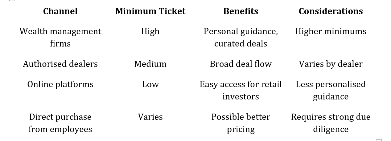 You buy them through wealth firms, authorised dealers, or online platforms that specialise in private market transactions.